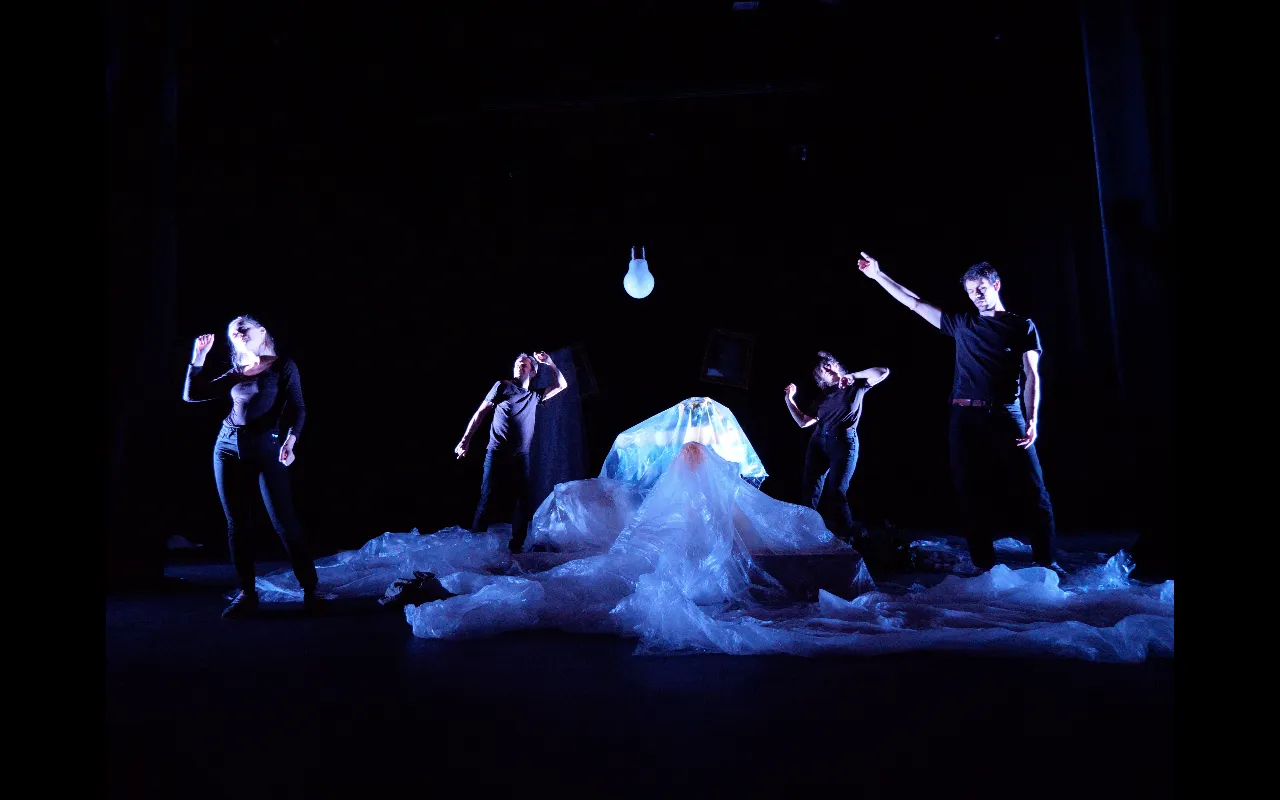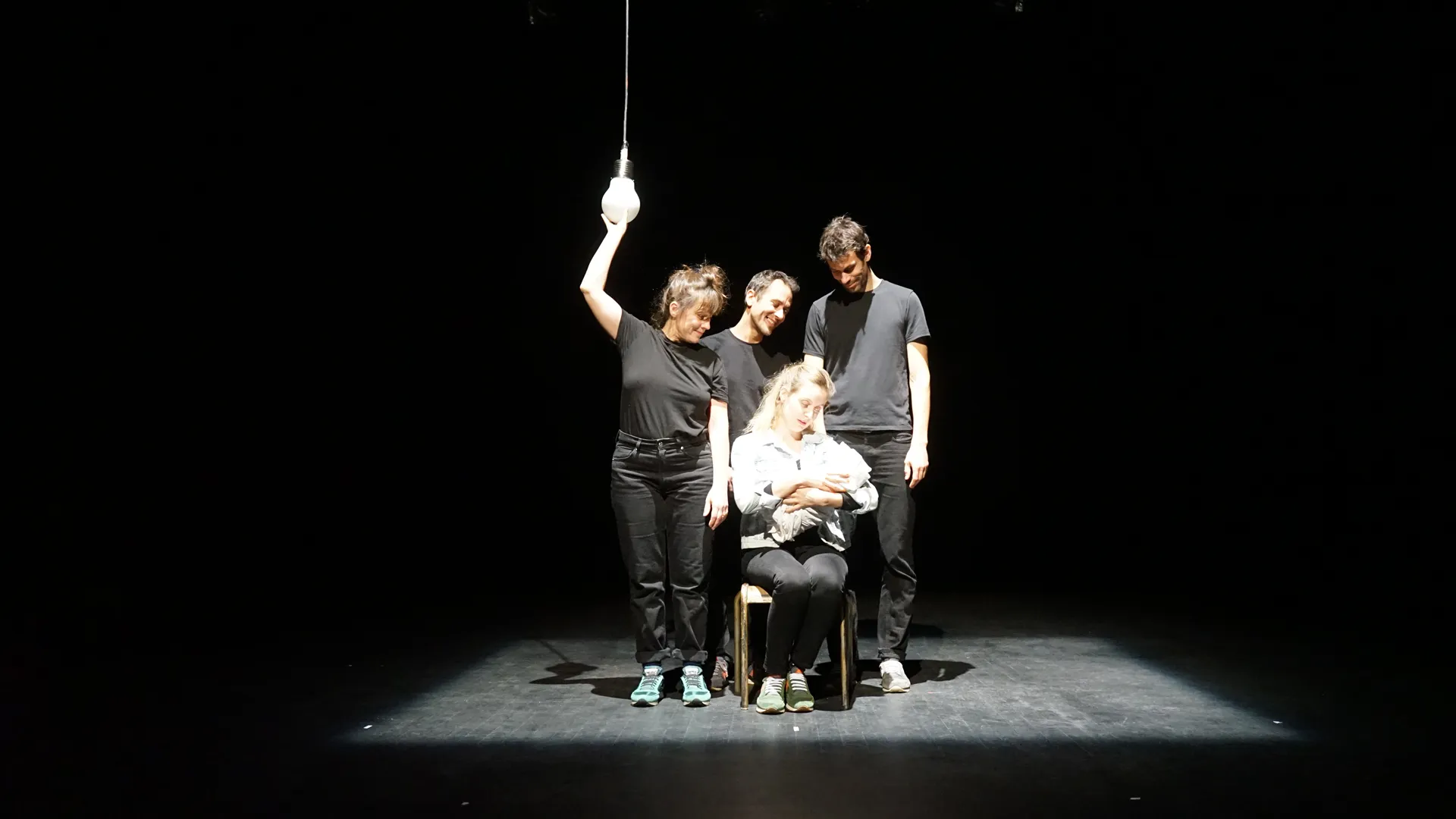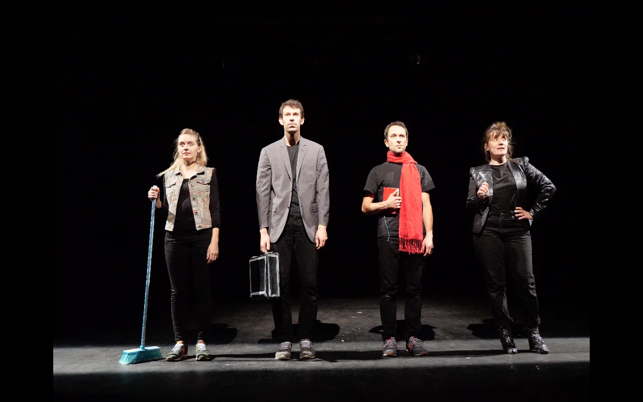 Sur scène, quatre comédiens parlent, bougent, et respirent d’un même souffle ; récitants aux faux-airs de choeur antique. Ils sont le théâtre. Et ils en jouent. La parole circule, se prend, se donne, se vole, tombe du ciel. Changement d’échelle, changement de point de vue, ellipses, travail sur les objets et les matières: nous déjouons les codes du théâtre pour créer des images et faire entrer la magie dans le quotidien.
